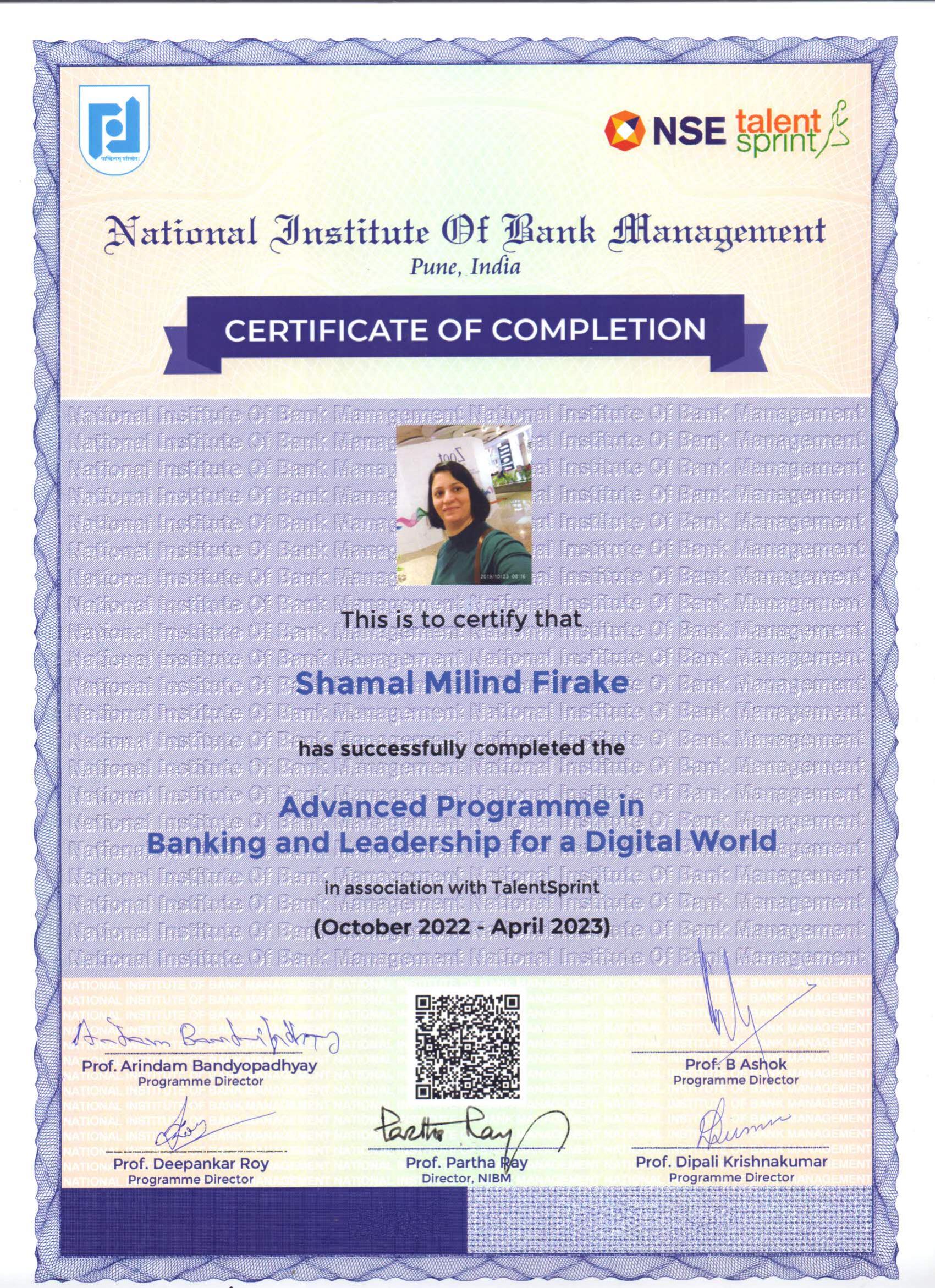 This programme brings a unique advantages that enables professionals to become digital first in the banking and financial services area. The program equips executives in the banking and information technology space to take up senior level positions in the world of technology enabled financial services industry. The curriculum includes four broad modules that covers Developments in Global Financial Markets and Credit Management in Digital World; Business Data Analytics and Financial Modeling, Technology Change in Banking, AI & Data Science and Block Chain; Modern Concepts of Risk Management, Digital Marketing and Customer Analytics and topics on Organizational Change Management & HR in Digital Space and Effective Leadership for Digital Business. The program includes a real world curriculum in a case based approach taught by leading researchers and experts in banking and fintech. The cohort goes through a rigorous program including regular evaluations, assignments and a capstone project. The course contains a full-fledged capstone project on data analytics, block-chain technology and applications in banking; Artificial Intelligence and Machine Learning Applications; Risk Management & Modeling and Digital Transformation. The entire programme is seamlessly delivered on TalentSprint’s digital learning platform ipearl.ai. The live interactive sessions are taken by NIBM faculty and digital practitioners. Group projects, numerous hands on exercises and Capstone projects are given to the participants for effective learning. The programme ends with three days NIBM campus visit along with an eventful certification ceremony.