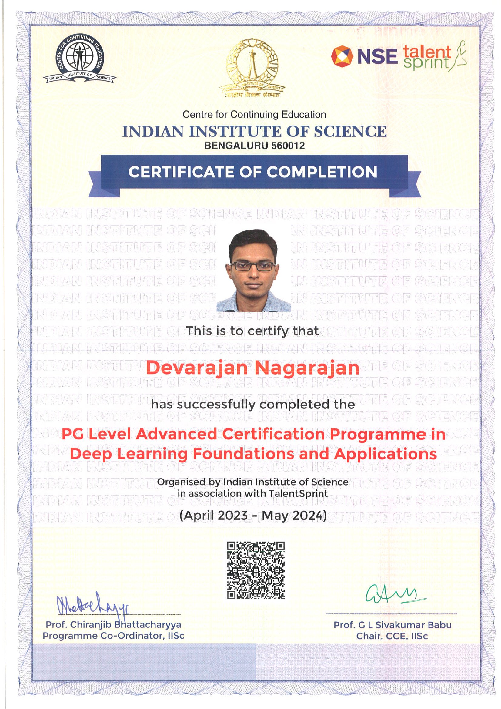The PG Level Advanced Certification Course in Deep Learning is offered by the Center of Continuing Education at IISc in collaboration with TalentSprint is a 10-month weekend program that enables both aspiring and practicing AI/ML professionals to build expertise in Deep Learning. The program covers the essential theoretical foundations of deep learning and teaches students how to apply them in the real world effectively. The course is best suited for individuals with programming knowledge who want to create a practical understanding of how machine learning algorithms can be developed and optimized for hardware. For more details visit https://iisc.talentsprint.com/deeplearning/index.html