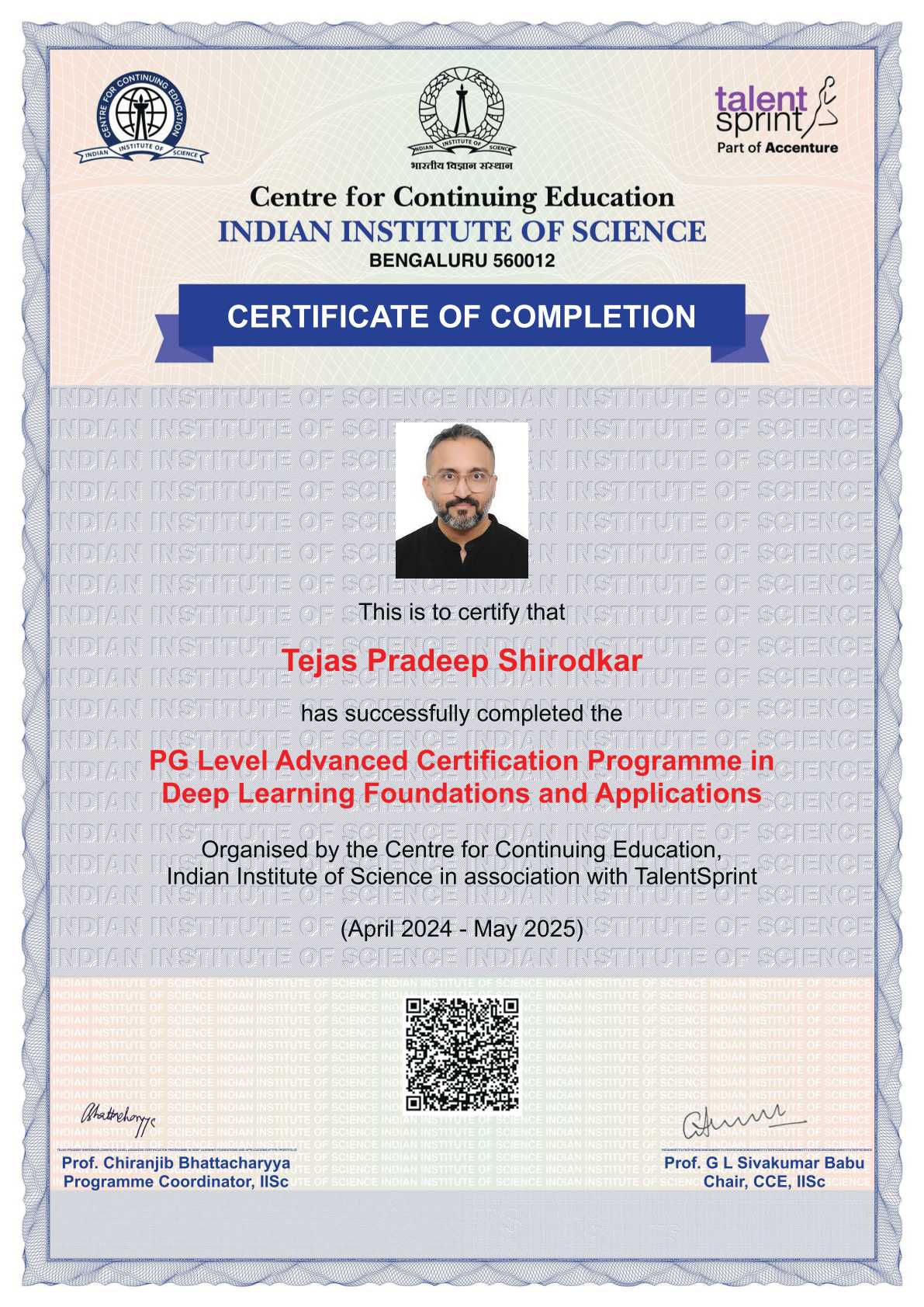 The PG Level Advanced Certification Course in Deep Learning is offered by TalentSprint in collaboration with Center of Continuing Education at IISc is a 10-month weekend program that enables both aspiring and practicing AI/ML professionals to build expertise in Deep Learning. The program covers the essential theoretical foundations of deep learning and teaches students how to apply them in the real world effectively. The course is best suited for individuals with programming knowledge who want to create a practical understanding of how machine learning algorithms can be developed and optimized for hardware. For more details visit https://iisc.talentsprint.com/deeplearning/index.html