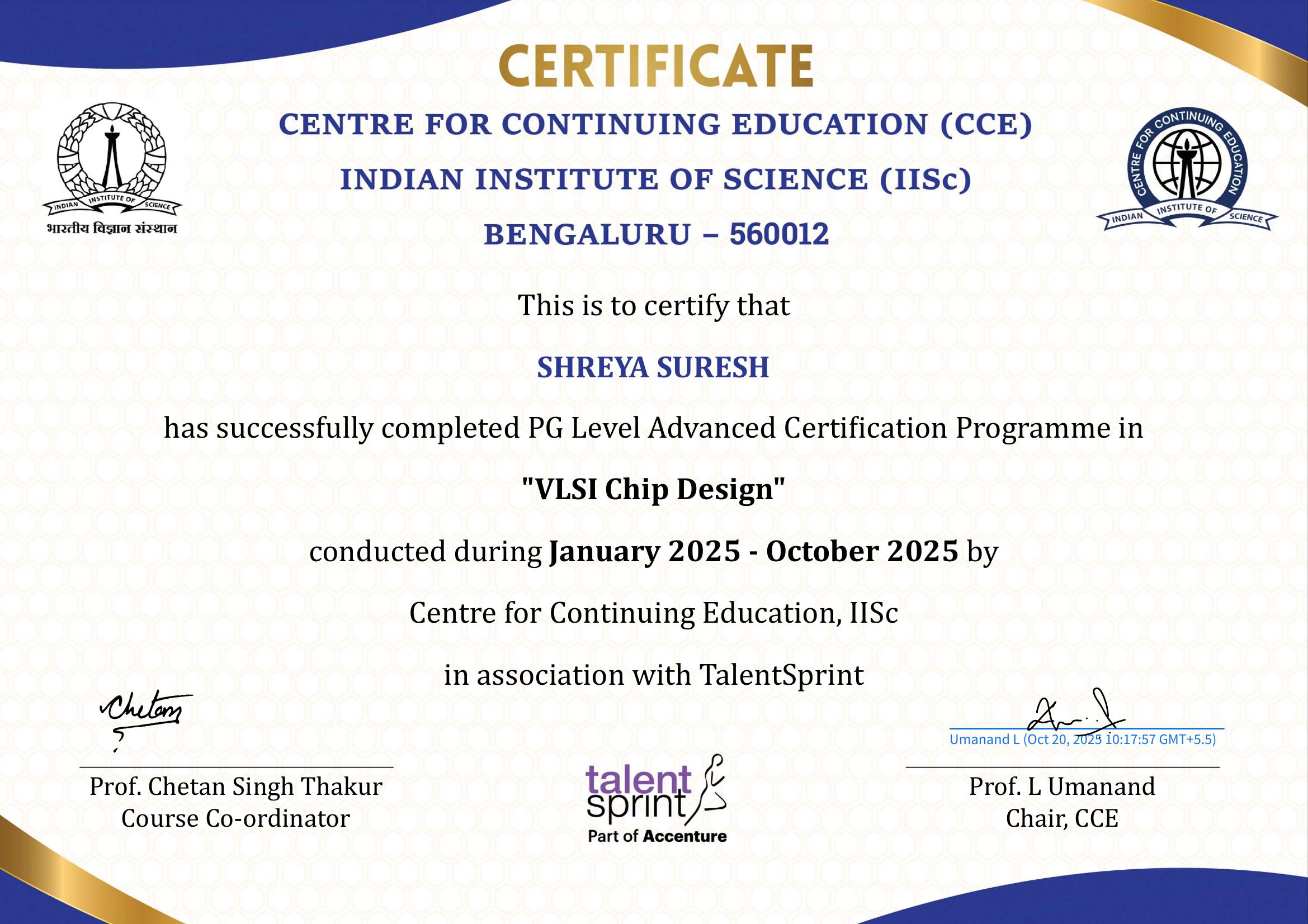 The PG Level Advanced Certification Programme in VLSI Chip Design enables professionals to build VLSI chip designing capabilities that can power new-age technologies like AI, IoT, VR, Mobility, Cloud, and Analytics. The Department of Electronic Systems Engineering, IISc, with its pioneering and ongoing research and training in VLSI chip design, is best positioned to offer this programme. The programme is ideal for VLSI industry professionals who want to leverage expertise of modern tools and technologies.